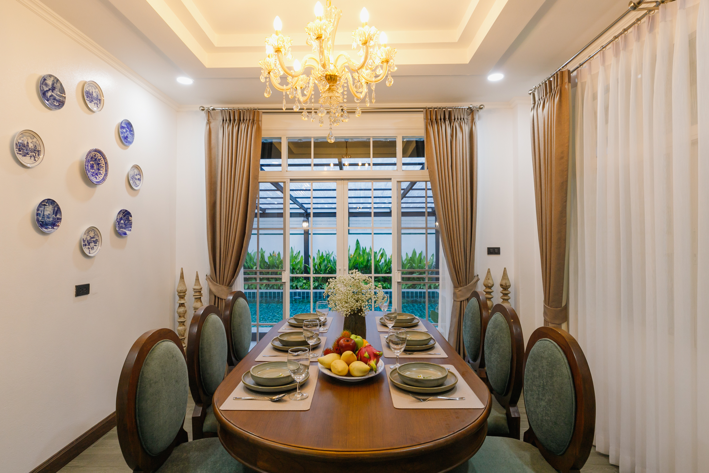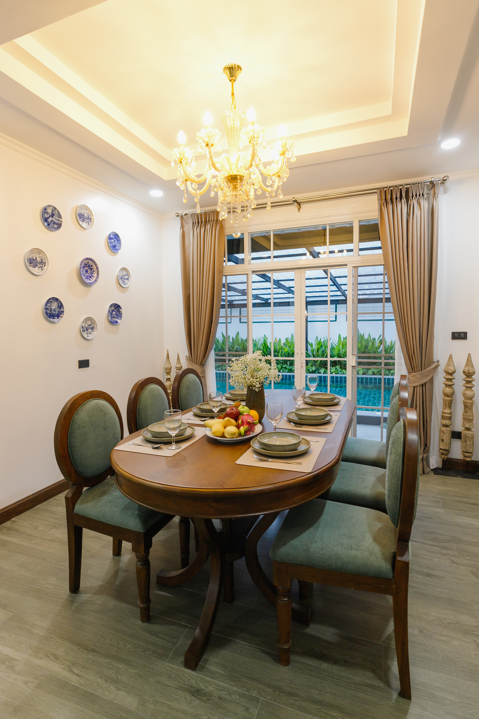 ห้องอาหาร พร้อมโต๊ะ–เก้าอี้รับประทานอาหาร และเคาน์เตอร์บาร์